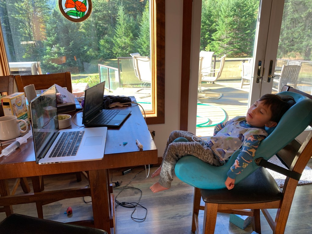 Now, I have to pause here to say that this last weekend of helicopter rides, intensive care, intubation and all of the resurfacing trauma has left me even less confident in my abilities to handle this life at the moment, than usual. (A blog post about all of that is half written but I haven’t had the emotional capacity to finish it yet) So, waking up to this morning’s chaos was really not what I needed at all. But Oliver had E-schooling, which of course, I was wildly unprepared for, so there was no time to fall apart.