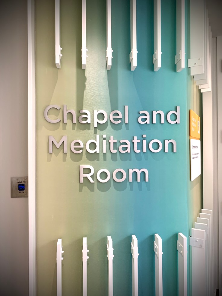 The chapel isn’t just a chapel. It’s also a meditation room. There was even a small gift basket with hand knitted prayers scarves inside. It’s a quiet, peaceful place with sacred art from faith traditions around the world. And there are rocking chairs…. One might be tempted to stay there all day.
