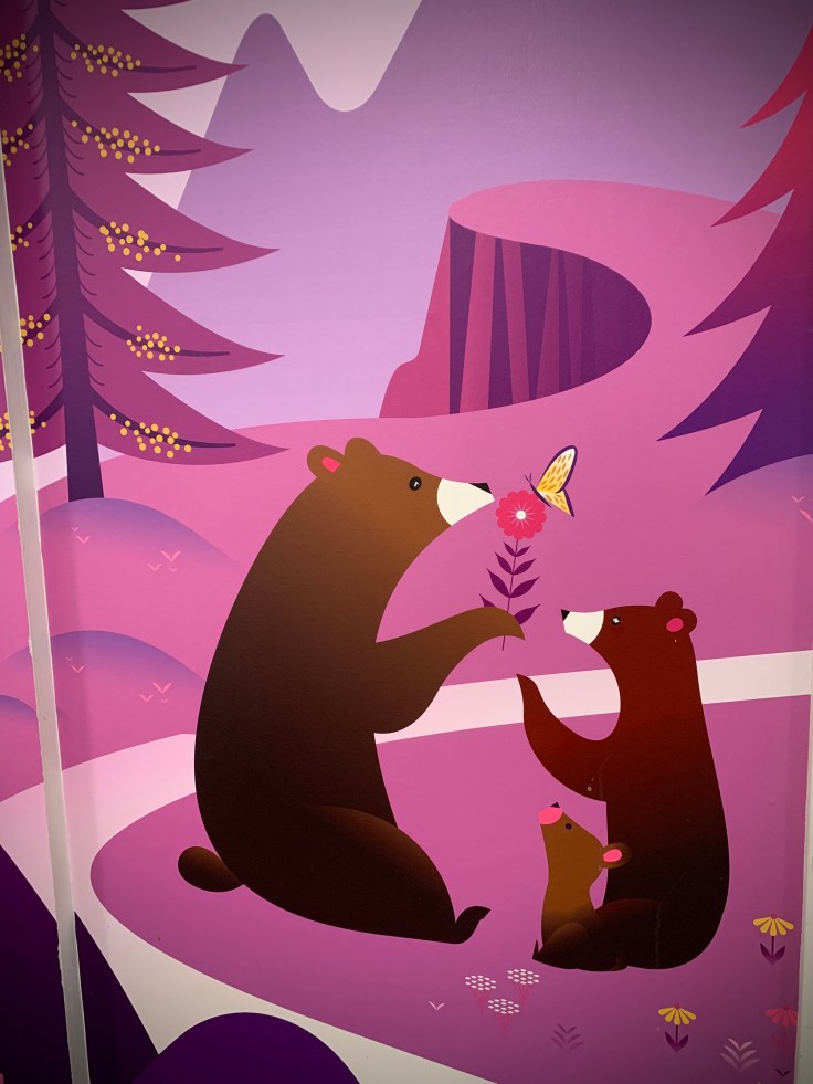 Friendly woodland creatures and bright murals cover the walls throughout the buildings.