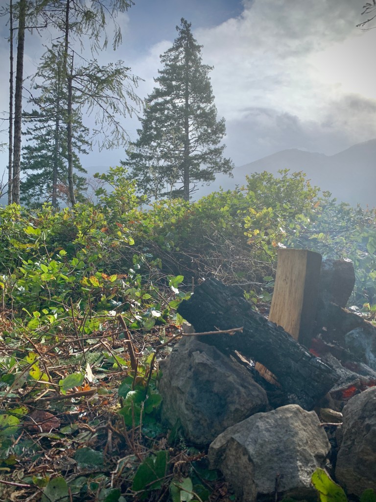 The raindrops fell harder and harder as I stumbled my way around the fire pit somehow tripping on every SINGLE Salal root sticking out of the, still wild, ground.